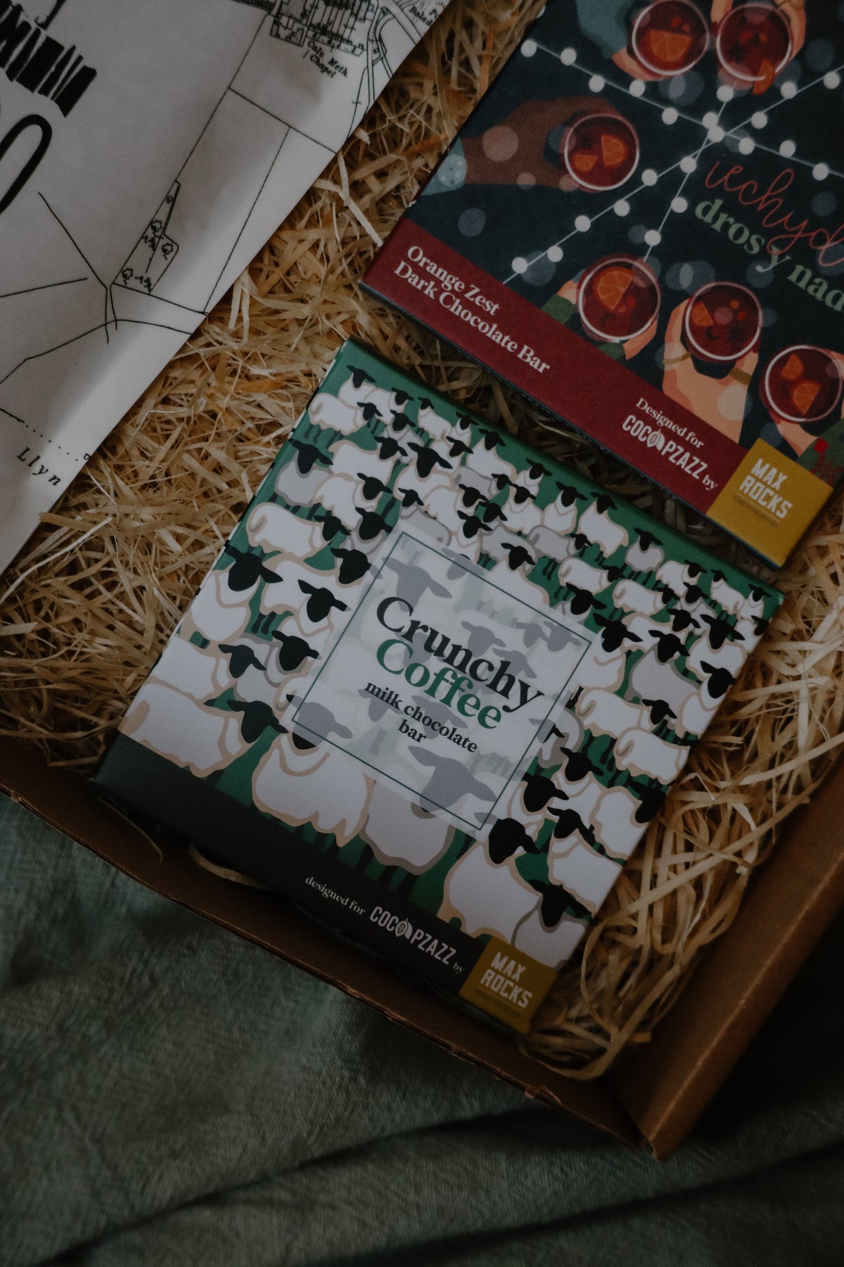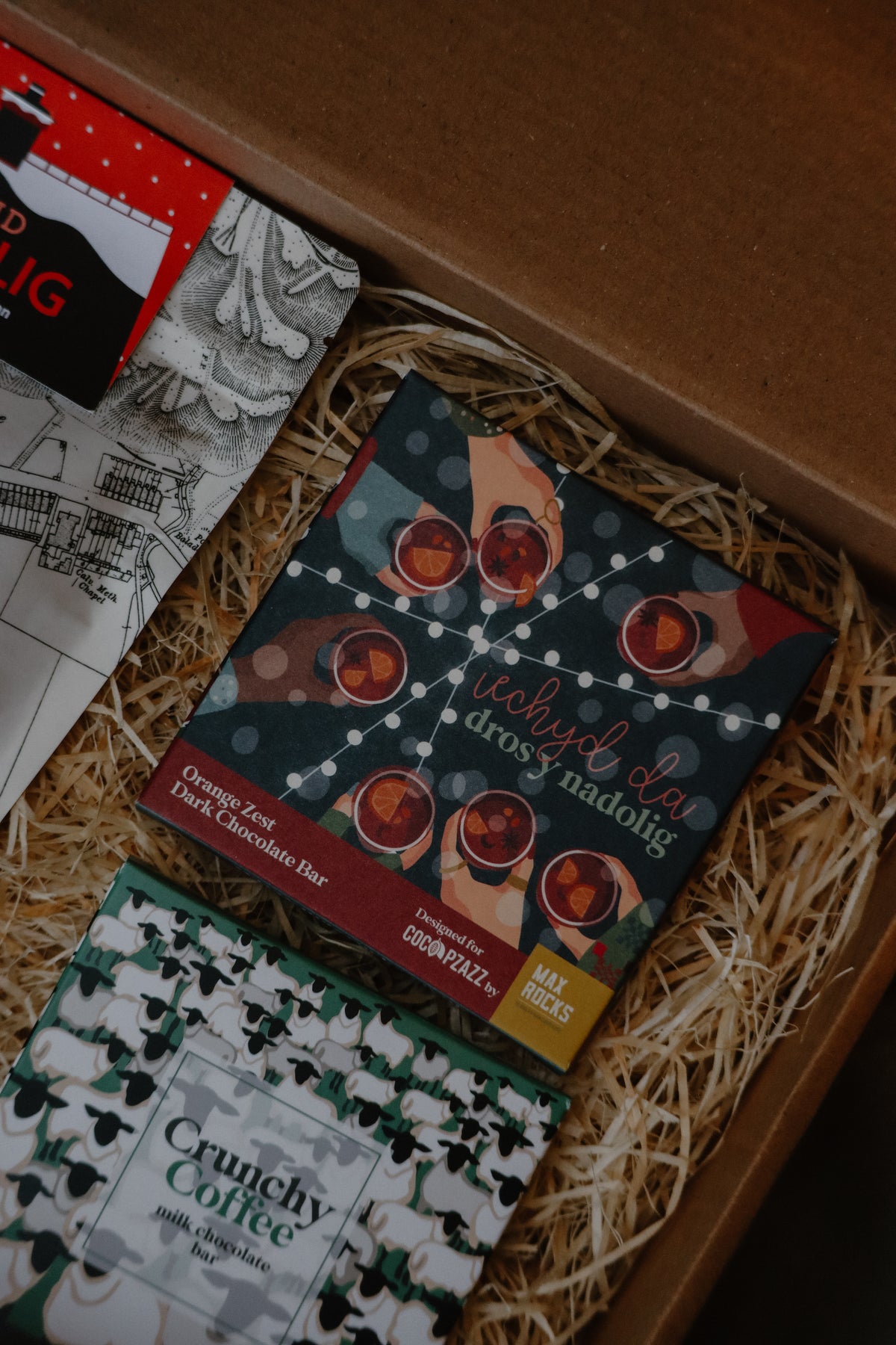 Coco Pzazz crunchy coffee chocolate crafted with Poblado’s single-origin Colombian beans, Zesty Orange Dark Chocolate Bar alongside a bag of our exclusive Christmas blend.