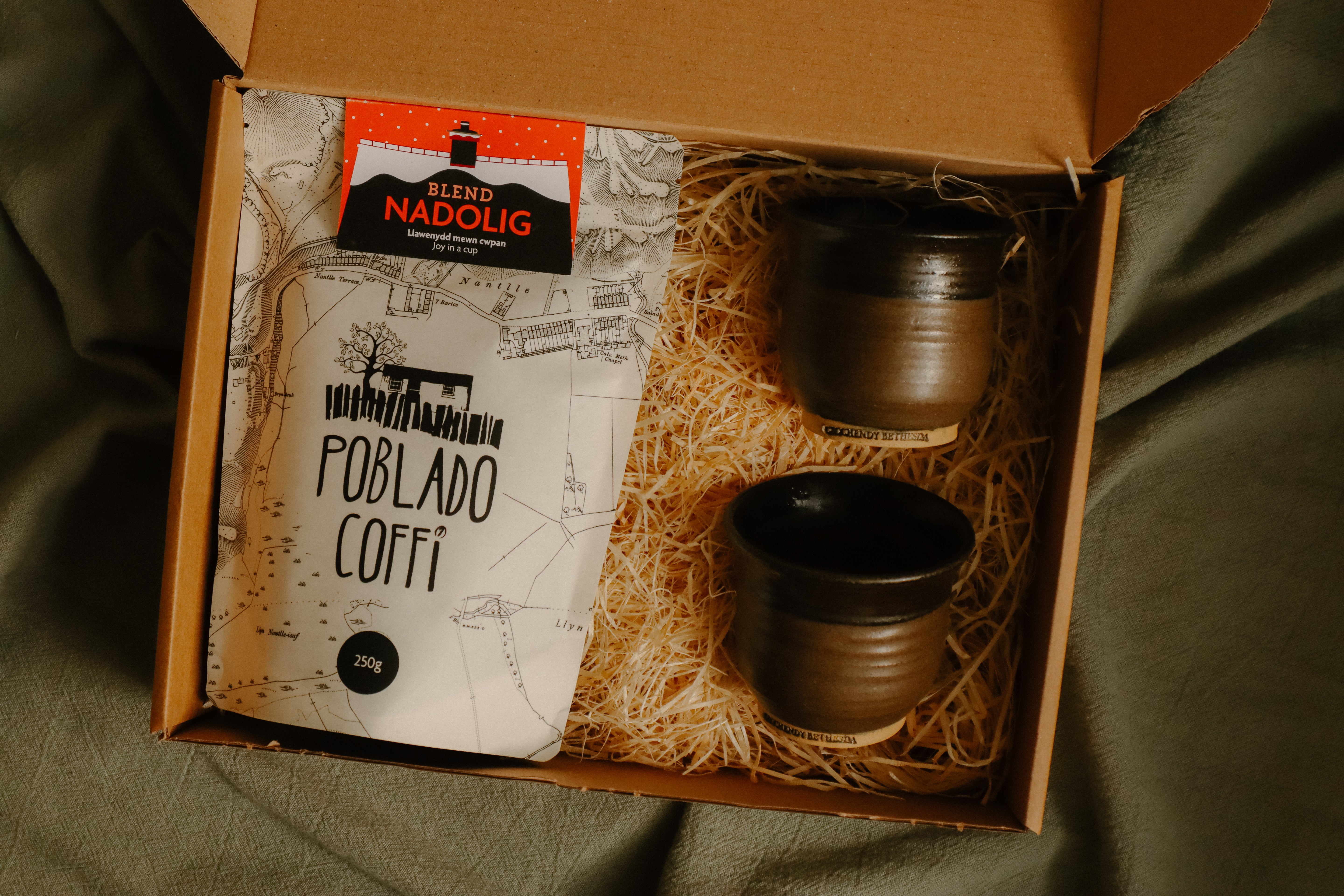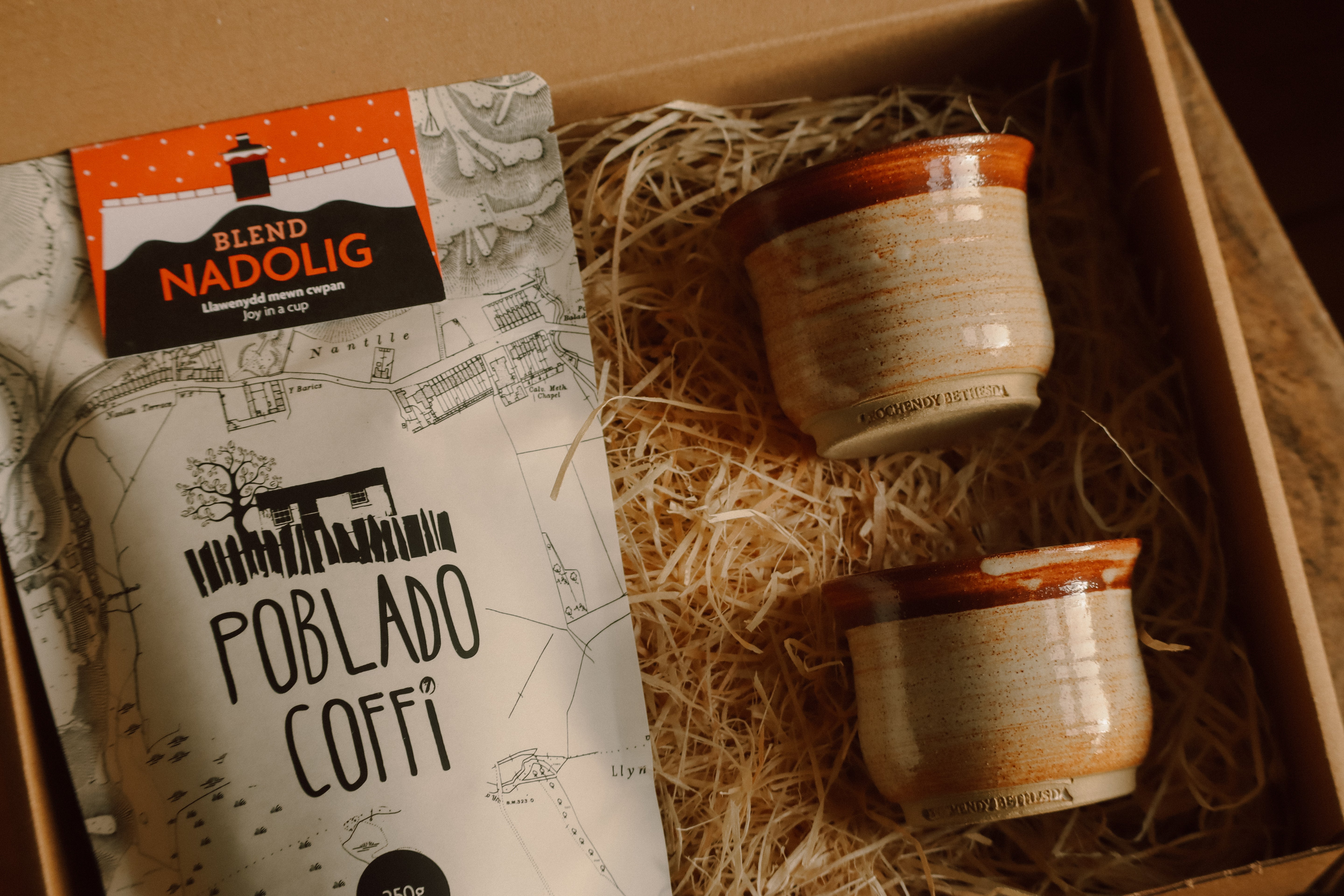 Two beautifully hand-made ceramic cups by Ian Dodgson at Crochendy Bethesda and our Christmas Blend.