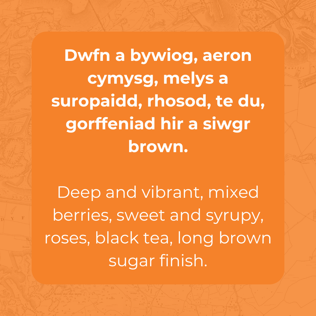 Dwfn a bywiog, aeron cymysg, melys a suropaidd, rhosod, te du, gorffeniad hir a siwgr brown.